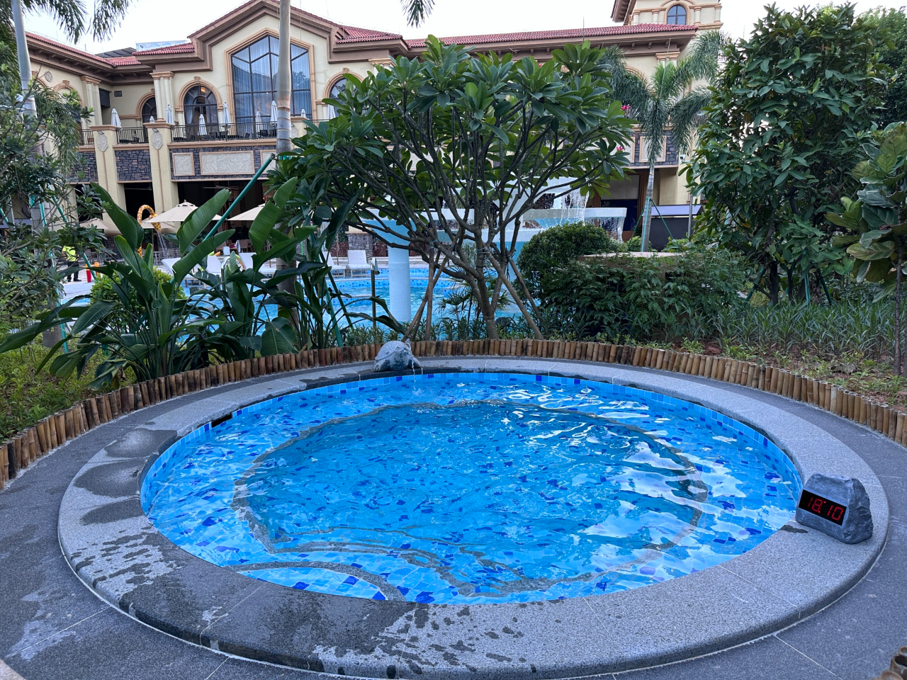 一边泡热汤,一边远眺园林景观